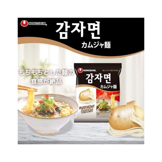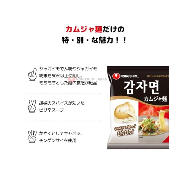 商品説明:麺にジャガイモでん粉やジャガイモ粉末を50%以上使用したもちもちとした麺の食感が絶品です。 スープは胡椒のスパイスが効いたピリ辛スープ、かやくとしてキャベツ、チンゲンサイを使用しています。 カムジャは韓国語でジャガイモの意味です。
