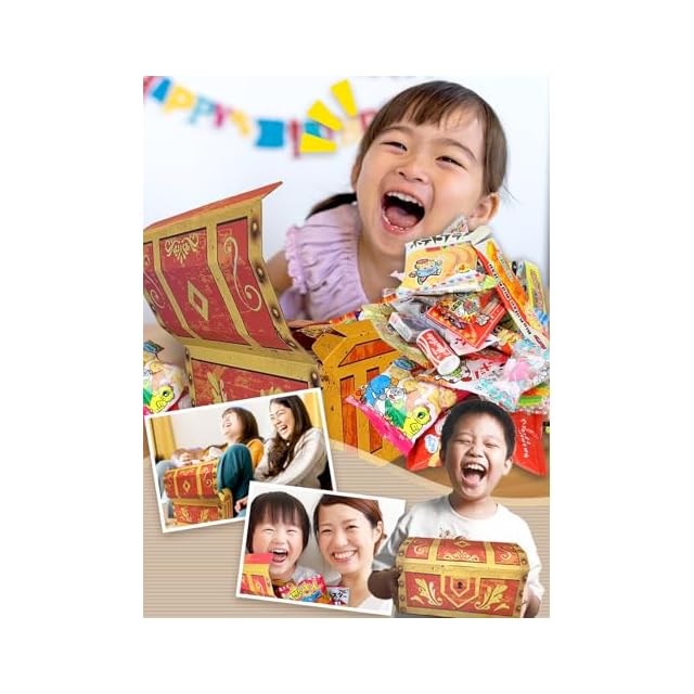 「どんなお菓子が入ってるかな?」開けるのがワクワク、ドキドキするような宝箱に、小分けにされた個包装の駄菓子をパンパンに詰め合わせた状態でお届け♪とてもおしゃれな宝箱デザインなので、お菓子を楽しんだ後は子供の宝物を保管する収納ボックスとしてもおすすめです。 ・人気の小袋駄菓子をアソートしました!「だがしランキング」にて高評価の人気お菓子を厳選!駄菓子好きにはたまらないラインナップ!
