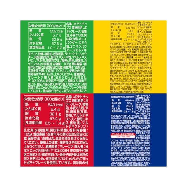 【サワークリーム&オニオン】100g当たり:熱量・・・532kcal、たんぱく質・・・5.7g、脂質・・・30.9g、炭水化物・・・57.6g、食塩相当量・・・1.0~2.2g【うましお】100g当たり:熱量・・・540kcal、たんぱく質・・・5.4g、脂質・・・32.1g、炭水化物・・・57.4g、食塩相当量・・・0.5~1.4g【Hi!CHEESE!】100g当たり:熱量・・・536kcal、たんぱく質・・・4.8g、脂質・・・30.8g、炭水化物・・・59.8g、食塩相当量・・・0.3~1.4【テリヤキ】100g当たり:熱量・・・529kcal、たんぱく質・・・5.3g、脂質・・・29.8g、炭水化物・・・59.9g、食塩相当量・・・0.5~1.5g