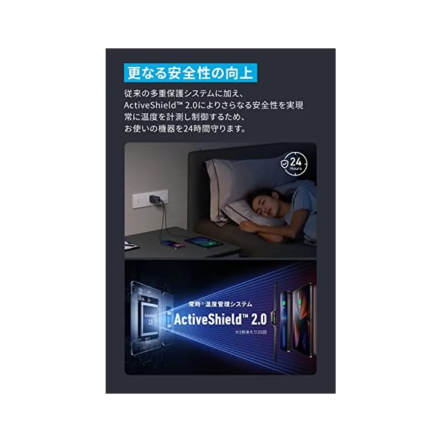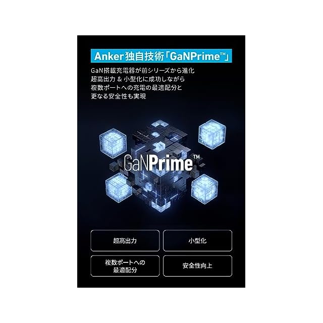 “同時” 急速充電という、新常識。Anker GaNPrimeシリーズ:Anker独自技術「GaNPrime」を採用し、GaN搭載充電器が前シリーズから進化 超高出力 & 小型化に成功しながら複数ポートへの充電の最適配分と更なる安全性も実現しました。
