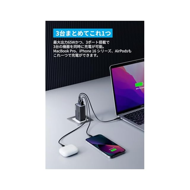 3台まとめてこれ1つ:最大出力65Wかつ、3ポート搭載で3台の機器を同時に充電が可能。MacBook Air、iPhone 16、AirPodsもこれ1つで充電ができます。