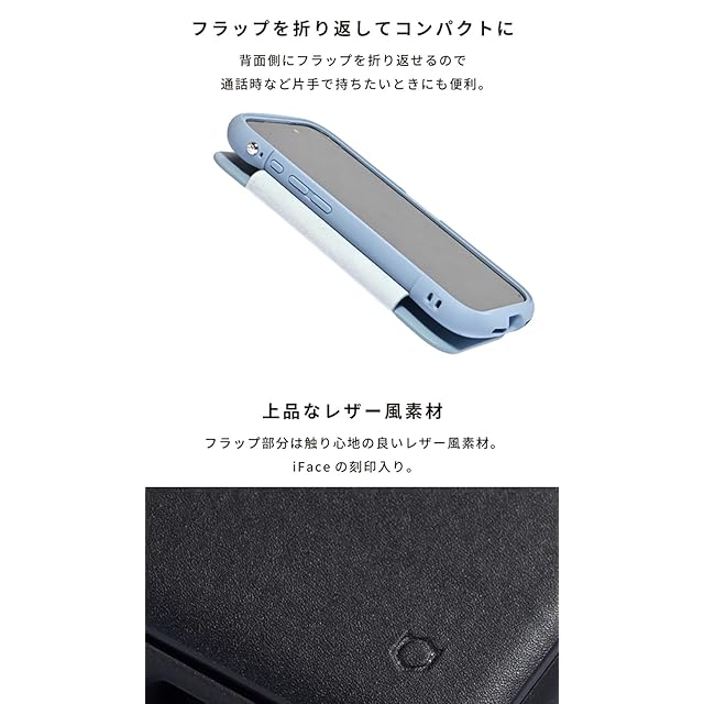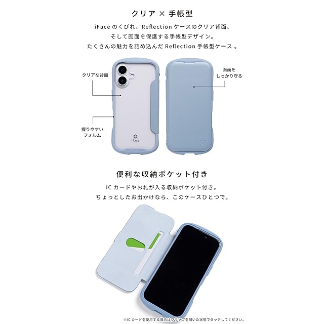 それぞれの長所をあわせ持ったクリア × 手帳型ケース<br><br>iFaceの大人気シリーズReflectionのクリア仕様を引き継いだ手帳型ケース。<br>手帳型の機能性を保ちつつ、ステッカーや写真が入れられるクリア背面で自分らしくカスタマイズが楽しめる!<br><br>・手にフィットする「くびれ」形状で持ちやすい<br>・弾力のあるTPUで、端末をしっかり保護<br>・クリアな背面に、シールや写真を入れてカスタマイズが可能<br>・背面はポリカーボネートとアクリルのハイブリッド素材で、割れにくい<br>・フラップにはカードポケット(1枚収納)付き<br>・フラップはケース背面に折り返すことが可能<br>・選べる2カ所のストラップホール<br>・シグネチャーボール搭載でストラップの付け方が広がる<br><br>●本製品ご使用における人体・デジタルデバイス本体を含む持ち物・データなどの損傷、損失、紛失に対し、弊社は一切の責任を負いかねます。<br>●本製品およびパッケージは改良のため予告なく仕様を変更する場合があります。<br>●記載されている製品名・会社名などは各社の商標または登録商標です。<br>●デジタルデバイス本体やケースに発熱などの異常がある場合は本製品を外してください。<br>●画面保護フィルムの形状により本製品と併用できない場合があります。<br>●背面カメラでの撮影時に写り込みが起こる場合があります。<br>●本製品内蔵のマグネットにより、デジタルデバイスのコンパスアプリやカメラ動作等に影響する場合があります。<br>●電子マネーアプリにカード情報が登録された状態では、本製品カードポケットに入れたICカード(Suica等)は読み込みができない場合があります。<br>その場合は、電子マネーアプリのカード登録を削除してご利用ください。<br>●ケースを閉じた状態でICカードが反応しない場合は、開いてご使用ください。<br>●本製品はマグネットを使用しております。カードポケットへの磁気カード(クレジットカード等)の収納は避けてください。<br>読み取りができなくなるおそれがあります。<br>●本製品はマグネットを使用しています。磁気カードや、通帳などに近づけないでください。読み取りができなくなる場合があります。<br>●使用している素材の特性上、爪やアクセサリーなどの先の尖った物によってケース表面に傷が付くことがあります。<br>●水濡れや摩擦等で衣服などに色移りしてしまう場合がありますのでご注意ください。<br>●ご使用の充電器や環境によってワイヤレス充電がご利用いただけない場合があります。<br>●ご利用状況・環境、溶剤の使用などにより変色や変質が起きることがあります。<br>●本製品装着やOSアップデートにより、デジタルデバイスの一部機能が使えなくなる可能性があります。<br>●小さな部品がありますので誤飲にご注意ください。<br><兼用ケースの場合><br>●複数の機種に装着可能なケースのため、ご使用の機種によっては一部のボタンやカメラ周りの隙間などが均等でなく片寄ることがあります。<br><br><br>商品仕様<br>15・14・13用:約縦16.4×横8.1×厚1.6cm、重量約76g<br>主素材:ポリウレタン、ポリカーボネート、アクリル、TPU、マグネット<br>ストラップ使用:可<br>ワイヤレス充電:可<br>:有