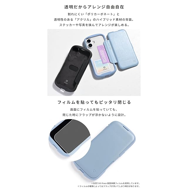 手にフィットする「くびれ」形状で持ちやすい / 弾力のあるTPUで、端末をしっかり保護 / ワントーンで揃えられたフチとフラップ / クリアな背面に、シールや写真を入れてカスタマイズが可能 / 背面はポリカーボネートとアクリルのハイブリッド素材で、割れにくい / フラップにはカードポケット(1枚収納)付き / フラップはケース背面に折り返すことが可能 / 選べる2カ所のストラップホール / シグネチャーボール搭載でストラップの付け方が広がる / iFaceスマホリング、iFace画面保護シートとの併用も可能※iFaceスマホリングと併用する際には一日ほど置くとしっかり貼り付きます。