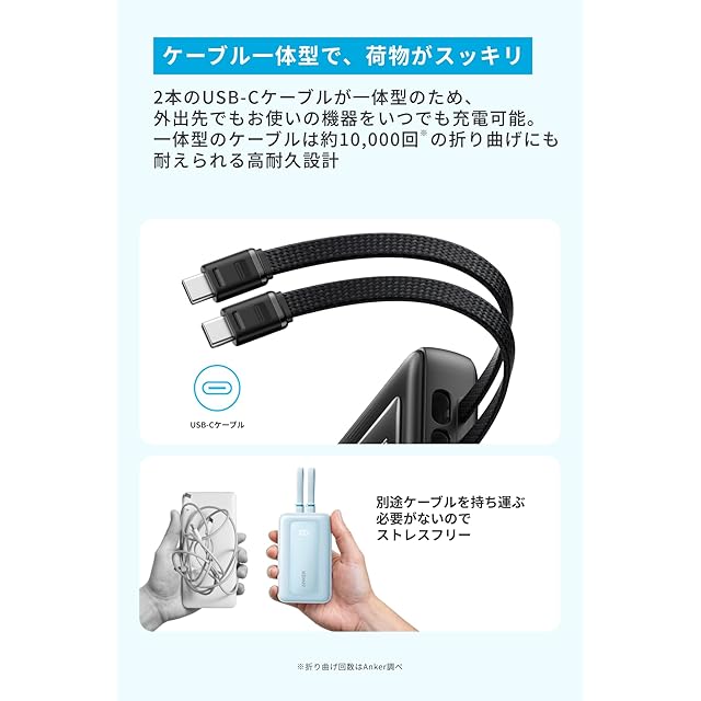 ケーブル一体型で、荷物がスッキリ:2本のUSB-Cケーブルが一体型のため、外出先でもお使いの機器をいつでも充電可能です。付属ケーブルは約10,000回の折り曲げにも耐えられる高耐久設計です。