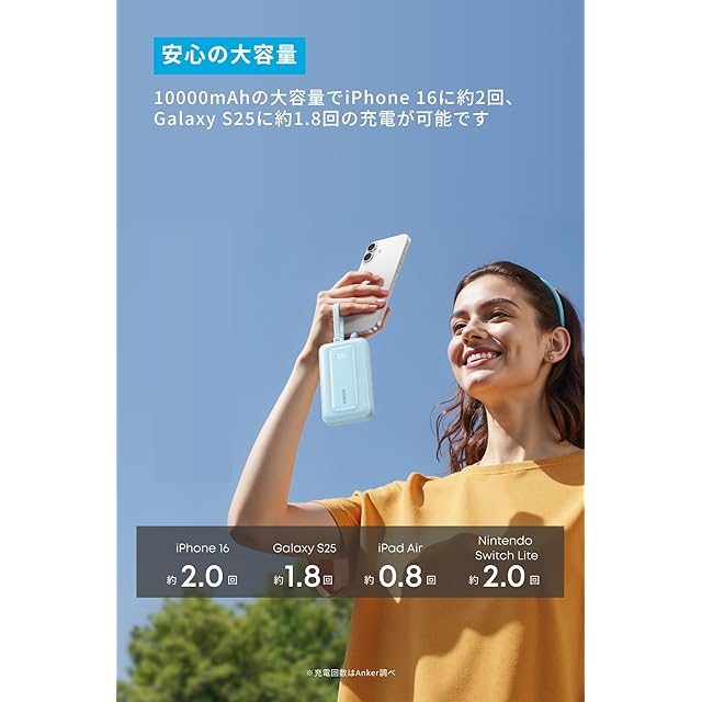 安心の大容量:10000mAhの大容量でiPhone 16に約2回、Galaxy S25に約1.8回の充電が可能です。