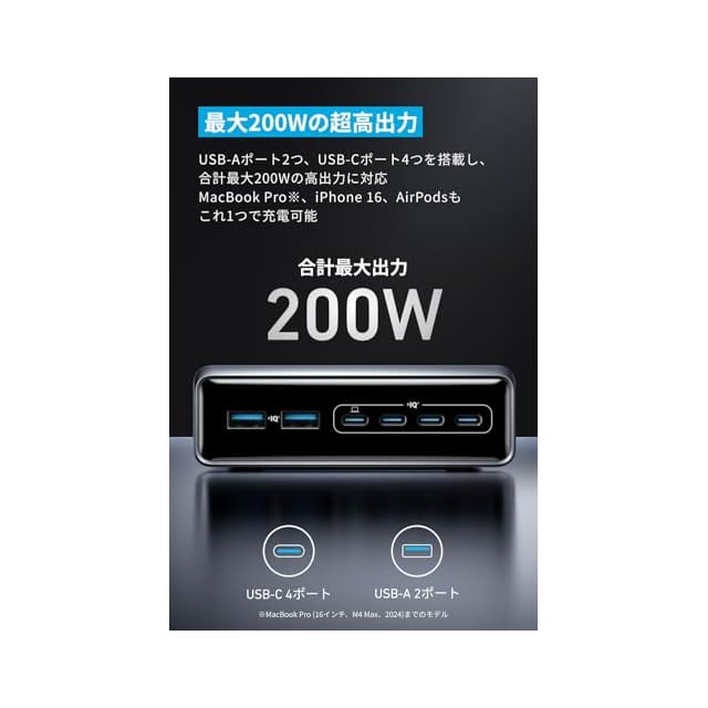 最大200Wの超高出力:USB-Aポート2つ、USB-Cポート4つを搭載し、合計最大200Wの高出力に対応。MacBook Pro、iPhone 16、AirPodsもこれ1つで充電ができます。