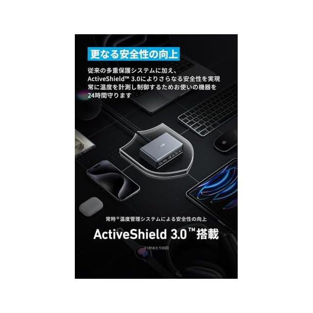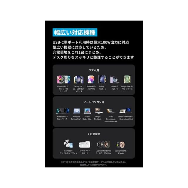 幅広い対応機種:USB-C 単ポート利用時は最大100W出力に対応。幅広い機器に対応しているため、充電環境をこれ1台にまとめ、デスク周りをスッキリと整理することができます。