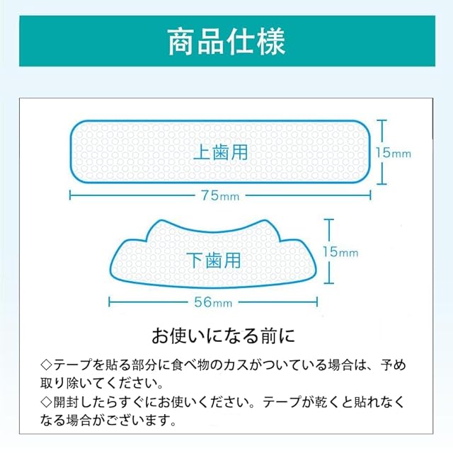 【使用方法】1.シート粘着面を、上の歯、下の歯にそれぞれ貼り付けます。2.しばらくそのまま時間を置きます。3.シートを剥がし、歯ブラシでよくブラッシングしてください。その際、お手持ちの歯磨き粉をご使用いただいても結構です。その後は口をよくすすいで、完了です。