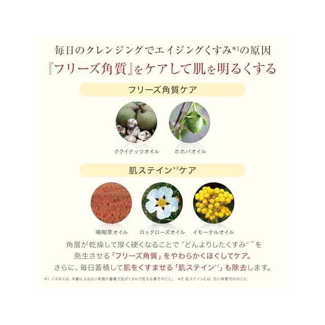 【しっとりとした洗い上がり】エイジングケアを見据え、8種の天然植物オイルを厳選。明るくやわらかな素肌へ洗い上げます。多角的なくすみ*ケアはもちろん、毛穴・角栓ケアのためのメドウフォームオイル、保湿・柔軟ケアのためのインカオメガオイルも配合しました。クレンジングオイルタイプが苦手な方にもおすすめです。*年齢による古い角質の蓄積で肌がくすんで見える様子のこと。
