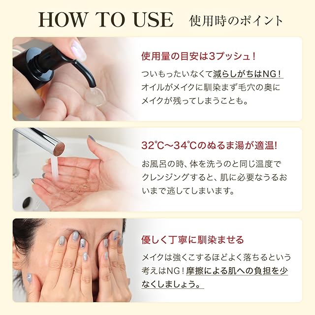 【摩擦レスの弾力オイル】厚みとクッション性にこだわった摩擦レスのクレンジングオイル。弾力のあるとろみがメイクにしっかりと絡んで浮かし、マスカラやリキッドアイライナーまでするんとオフ。贅沢な使用感と素早いメイク落としを両立させました。W洗顔不要・濡れた手でもOK・まつ毛エクステにも使えるクレンジングです。