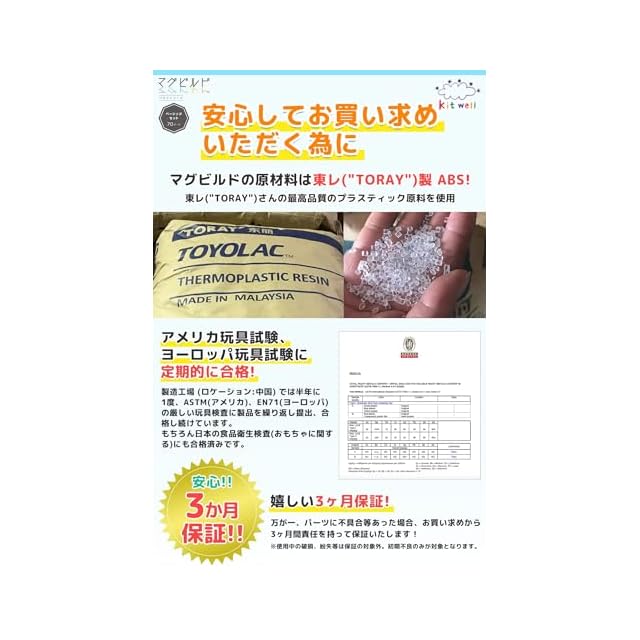 しっかりとした磁力を持ちながら、お子様が指を挟んでも痛くならない安全仕様。万が一、口に入れても安心のABS素材を使用した磁石おもちゃ。日本の食品検査に合格しています。ひらめきの力を育む知育玩具です