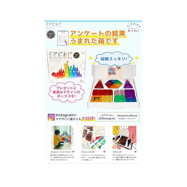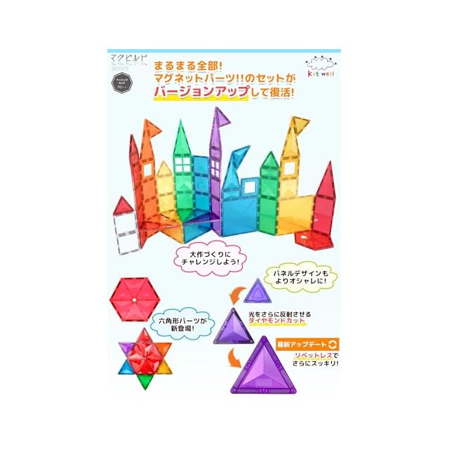警告: この商品には小さな磁石が含まれています。磁石を飲み込んでしまった場合、腸全体に粘着し、重度の感染症や死亡を引き起こします。磁石を飲み込んだり、吸い込んだりした場合は、すぐに医師の診察を受けてください。 磁石でピタッとくっ付くのでズレるのを気にする必要がなく、小さいお子様でも思い通り・偶然問わず「平面」から「立体」を構成する事が出来る新感覚の磁石ブロックです。 面だけで出来たパーツを組み立てる事で、面で構成される形の概念を「目で見て」「触れて」自然と理解出来るようになるマグネットブロックです。 プレゼントした大人も一緒に楽しく遊べるほどの対象年齢の幅広さも魅力の一つです。遊んであげているという意識も少なくなり、お子様との楽しい時間をお過ごしいただけます。 小さい頃はくっついた・離れたの繰り返しで図形の多様性を、小学生になったら算数の台形の面積計算などで必要な形の分解を、中学生からは立体の図形の体積・表面積の複雑な構造理解に役立ちます。 ひとりひとりの子どもたちに、たのしい時間を。未来のおもちゃ 知育を考える。Kit Well(キット ウェル)は知育玩具の企画・開発を通じて、日本の子どもたちの成長をサポートします。