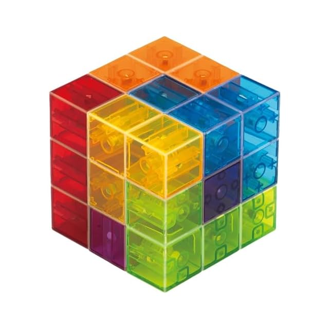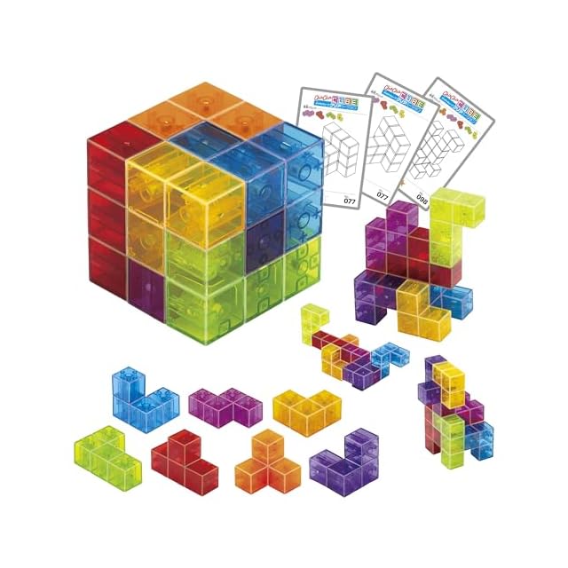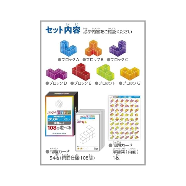 セット内容:ブロック(7種類各1個)・問題カード54枚(両面印刷仕様)・解答集1冊 / 対象年齢:3歳~ / 本体サイズ(立方体時):W60×H60×D60mm