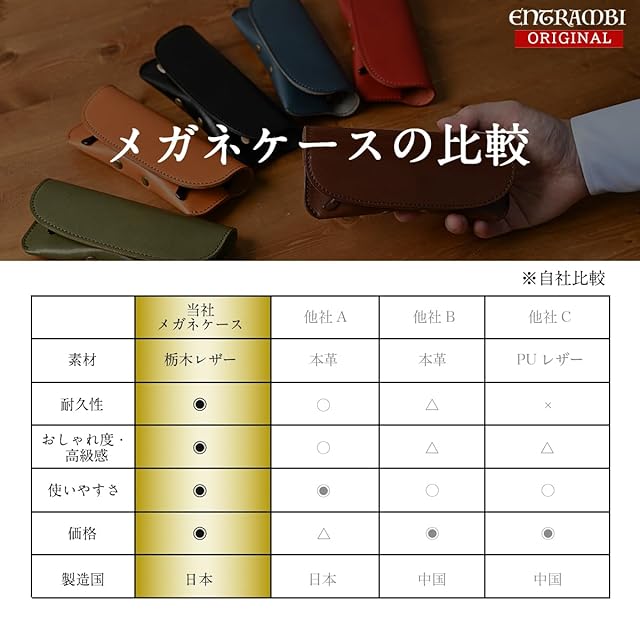 「大阪の職人のこだわりと技術」 大阪の堺にある小さな革工房の職人さんが丁寧に一つひとつ作り上げます。厳選した栃木レザーは慎重に裁断し、ラウンド型の上蓋を開いた時に見える部分にはネン引きと呼ばれる飾り線を職人技で施すことでデザインを格上げします。もちろん使う糸も金具もすべて日本製の最高級のもので縫製して仕上げます。本革の素材の良さが際立つ高級感のあるメガネケースです。 「シーンを選ばない"斬新"なデザイン」 メガネのツルを間に挟んで収納するというデザインで、ツルの端が少しチラ見えするのでSNS映えにもなりオシャレです。もちろん内部には同じ革で作った鼻パッドもついているため眼鏡も傷つきません。 化粧箱に梱包しておりますので大切な人への贈り物としても喜ばれること間違いなしです。 ENTRAMBIはイタリア語で「共に」という意味です。ENTRAMBIの名のごとく本革の経年変化と共に長くご愛用頂けるメガネケースです。
