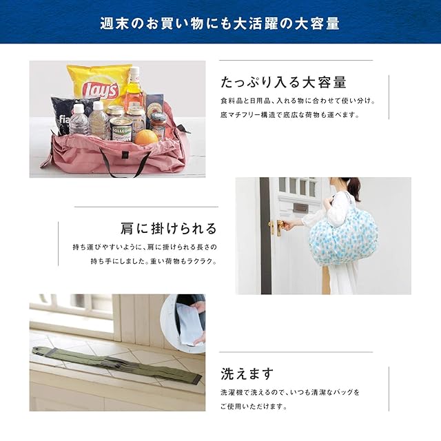 【レジカゴにかけられる大容量サイズ】1週間のまとめ買いにもおすすめのLサイズ。買い物の精算時、レジカゴにセットすれば、荷物を移し変える必要もなく、そのまま持ち帰ることが出来るので時短にも。袋口にボタンがついているので中身がこぼれにくく、持ち手が長く肩がけできて重い荷物もラクラク。