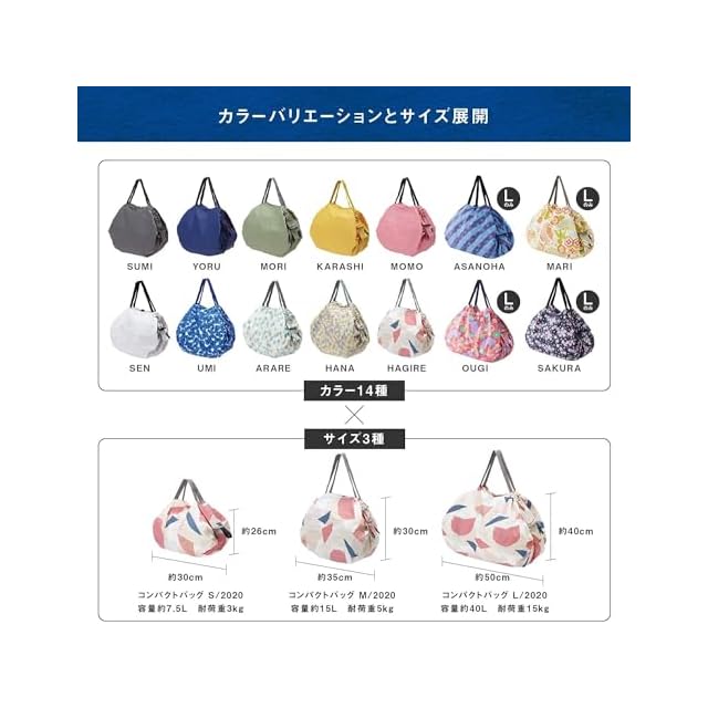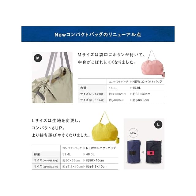 【さらにコンパクトに、もっと大容量に。】丸めた時の直径は約6.5cmで重さは約118g。Mサイズと同じ生地へ変更し、従来のLサイズより軽く、コンパクトに。また、耐荷重(約15kg)はそのままに容量は約40Lにアップし、もっとたっぷりと入れられるようになりました。