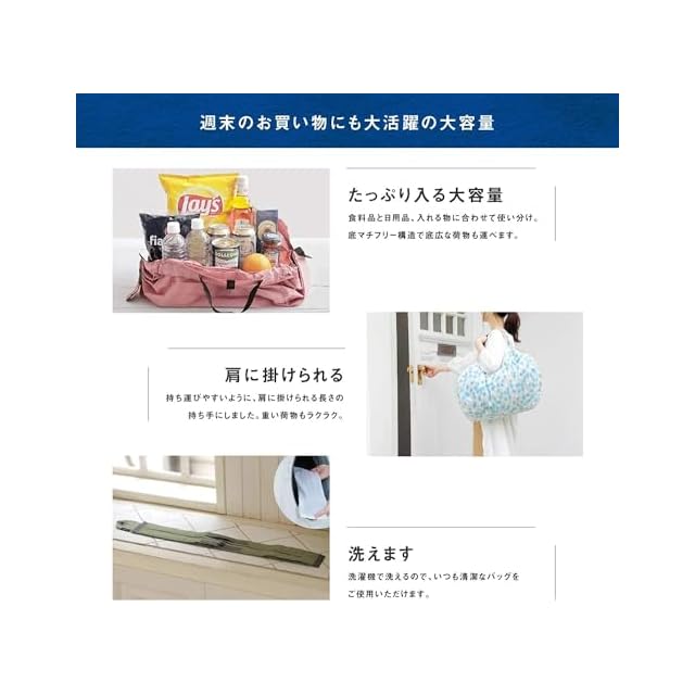 【レジカゴにかけられる大容量サイズ】1週間のまとめ買いにもおすすめのLサイズ。買い物の精算時、レジカゴにセットすれば、荷物を移し変える必要もなく、そのまま持ち帰ることが出来るので時短にも。袋口にボタンがついているので中身がこぼれにくく、持ち手が長く肩がけできて重い荷物もラクラク。