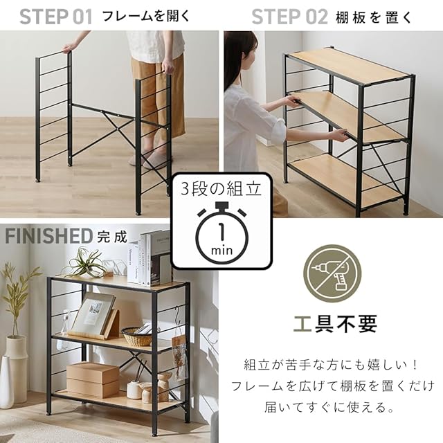 簡単に組み立てができるスチールラックです。フレームを広げて棚板を取り付けるだけですぐに使えます。
