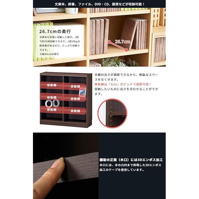 商品番号【TNL-9044-DK】<br> 棚板をすべて移動でき、A4ファイル・雑誌、コミックなど高さが異なる書籍もまとめて収納できます。<br> オリジナルピン付き棚ダボで側板が開くのを防ぎます。<br> 幅木よけ加工を施してあるので、本棚を壁面にピッタリ付けて設置できます。<br> 【商品詳細】<br> ■外寸:幅44×奥行29×高さ90cm<br> ■内寸:幅40.4×奥行26.7×高さ78.9cm<br> ■カラー:ブラウン<br> ■天板耐荷重:10kg<br> ■地板・棚板耐荷重:10kg<br> ■移動棚:3枚<br> ■棚板移動ピッチ:30mm<br> ■材質:[本体]プリント紙化粧繊維板<br> 【お客様の組立品】<br> ※組立に必要な工具:プラスドライバー、ハンマー、古雑誌<br> 【注意事項】<br> 背板は、中央でテープ留めになっています。<br> 本体の強度を維持する為、少なくとも移動棚1枚を中央付近に取付けて下さい。<br>