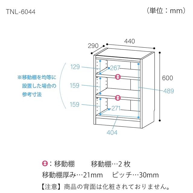 商品番号【TNL-6044-DK】<br> 棚板をすべて移動でき、A4ファイル・雑誌、コミックなど高さが異なる書籍もまとめて収納できます。<br> オリジナルピン付き棚ダボで側板が開くのを防ぎます。<br> 幅木よけ加工を施してあるので、本棚を壁面にピッタリ付けて設置できます。<br> 【商品詳細】<br> ■外寸:幅44×奥行29×高さ60cm<br> ■内寸:幅40.4×奥行26.7×高さ48.9cm<br> ■カラー:ブラウン<br> ■天板耐荷重:10kg<br> ■地板・棚板耐荷重:10kg<br> ■移動棚:2枚<br> ■棚板移動ピッチ:30mm<br> ■材質:[本体]プリント紙化粧繊維板<br> 【お客様の組立品】<br> ※組立に必要な工具:プラスドライバー、ハンマー、古雑誌<br> 【注意事項】<br> 背板は、中央でテープ留めになっています。<br> 本体の強度を維持する為、少なくとも移動棚1枚を中央付近に取付けて下さい。<br>