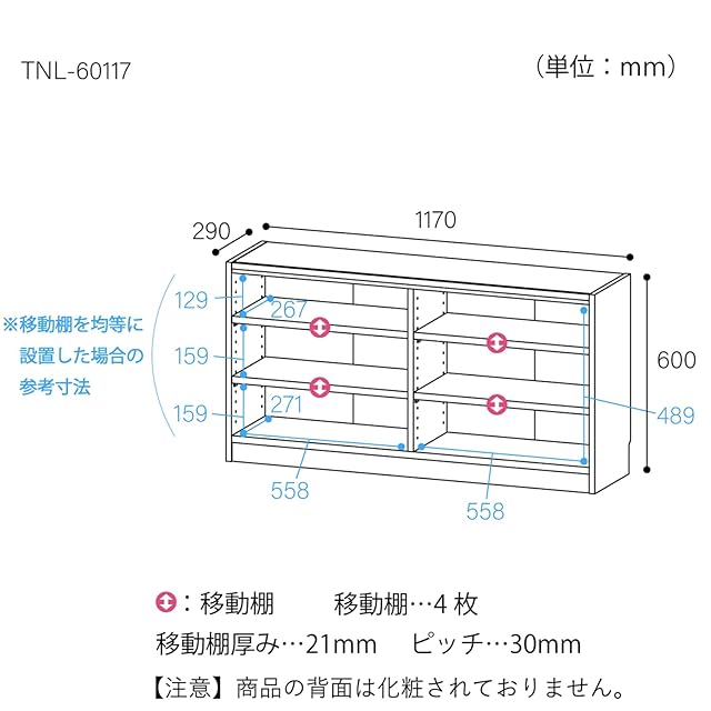 商品番号【TNL-60117-DK】<br> 棚板をすべて移動でき、A4ファイル・雑誌、コミックなど高さが異なる書籍もまとめて収納できます。<br> オリジナルピン付き棚ダボで側板が開くのを防ぎます。<br> 幅木よけ加工を施してあるので、本棚を壁面にピッタリ付けて設置できます。<br> 【商品詳細】<br> ■外寸:幅117×奥行29×高さ60cm<br> ■内寸:幅55.8×奥行26.7×高さ48.9cm<br> ■カラー:ブラウン<br> ■天板耐荷重:10kg<br> ■地板・棚板耐荷重:10kg<br> ■移動棚:2枚<br> ■棚板移動ピッチ:30mm<br> ■材質:[本体]プリント紙化粧繊維板<br> 【お客様の組立品】<br> ※組立に必要な工具:プラスドライバー、ハンマー、古雑誌<br> 【注意事項】<br> 左右の背板は、中央でテープ留めになっています。<br> 本体の強度を維持する為、左右の棚それぞれに少なくとも移動棚1枚を中央付近に取付けて下さい。<br>