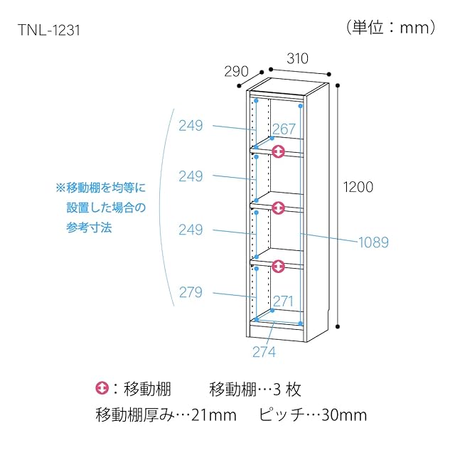 商品番号【TNL-1231-NA】<br> 棚板をすべて移動でき、A4ファイル・雑誌、コミックなど高さが異なる書籍もまとめて収納できます。<br> オリジナルピン付き棚ダボで側板が開くのを防ぎます。<br> 幅木よけ加工を施してあるので、本棚を壁面にピッタリ付けて設置できます。<br> 【商品詳細】<br> ■外寸:幅31×奥行29×高さ120cm<br> ■内寸:幅27.4×奥行26.7×高さ108.9cm<br> ■カラー:ナチュラル<br> ■天板耐荷重:10kg<br> ■地板・棚板耐荷重:10kg<br> ■移動棚:3枚<br> ■棚板移動ピッチ:30mm<br> ■材質:[本体]プリント紙化粧繊維板<br> 【お客様の組立品】<br> ※組立に必要な工具:プラスドライバー、ハンマー、古雑誌<br> 【注意事項】<br> 本体の強度を維持する為、少なくとも移動棚1枚を中央付近に取付けて下さい。<br>