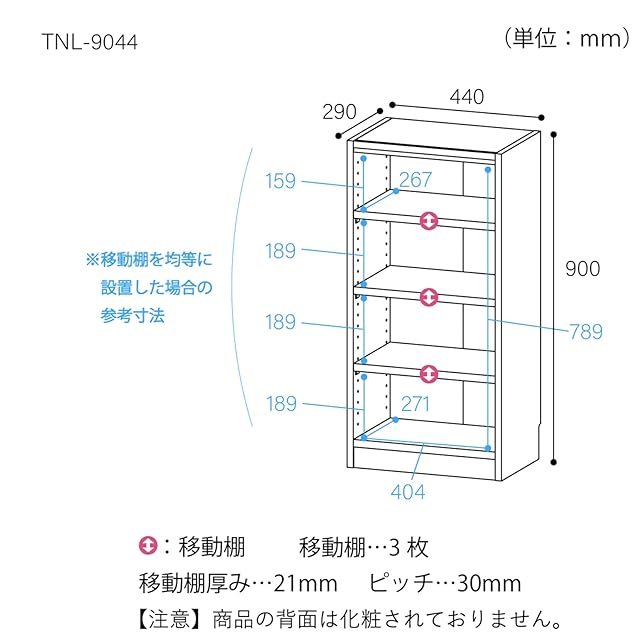 商品番号【TNL-9044-NA】<br> 棚板をすべて移動でき、A4ファイル・雑誌、コミックなど高さが異なる書籍もまとめて収納できます。<br> オリジナルピン付き棚ダボで側板が開くのを防ぎます。<br> 幅木よけ加工を施してあるので、本棚を壁面にピッタリ付けて設置できます。<br> 【商品詳細】<br> ■外寸:幅44×奥行29×高さ90cm<br> ■内寸:幅40.4×奥行26.7×高さ78.9cm<br> ■カラー:ナチュラル(ベージュ)<br> ■天板耐荷重:10kg<br> ■地板・棚板耐荷重:10kg<br> ■移動棚:3枚<br> ■棚板移動ピッチ:30mm<br> ■材質:[本体]プリント紙化粧繊維板<br> 【お客様の組立品】<br> ※組立に必要な工具:プラスドライバー、ハンマー、古雑誌<br> 【注意事項】<br> 背板は、中央でテープ留めになっています。<br> 本体の強度を維持する為、少なくとも移動棚1枚を中央付近に取付けて下さい。<br>
