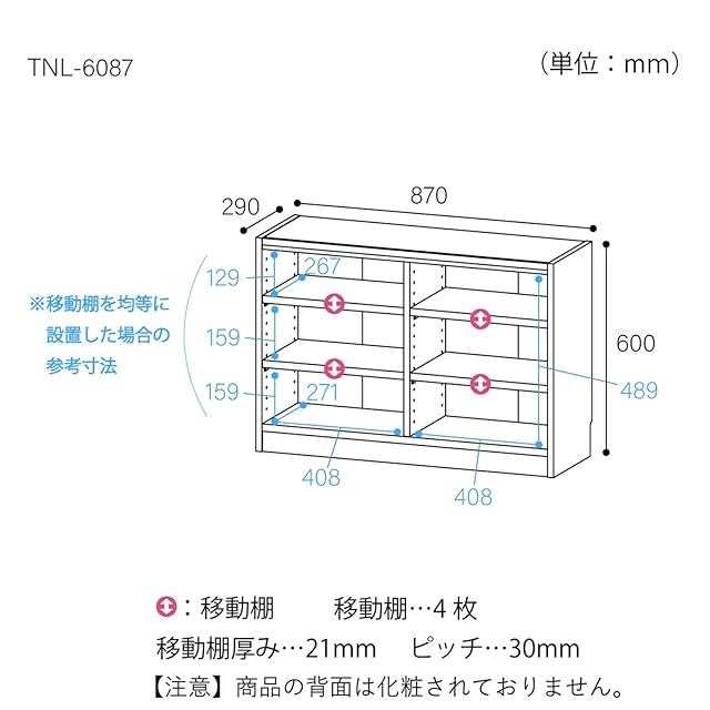 商品番号【TNL-6087-NA】<br> 棚板をすべて移動でき、A4ファイル・雑誌、コミックなど高さが異なる書籍もまとめて収納できます。<br> オリジナルピン付き棚ダボで側板が開くのを防ぎます。<br> 幅木よけ加工を施してあるので、本棚を壁面にピッタリ付けて設置できます。<br> 【商品詳細】<br> ■外寸:幅87×奥行29×高さ60cm<br> ■内寸:幅40.8×奥行26.7×高さ48.9cm×2列<br> ■カラー:ナチュラル(ベージュ)<br> ■天板耐荷重:10kg<br> ■地板・棚板耐荷重:10kg<br> ■移動棚:4枚<br> ■棚板移動ピッチ:30mm<br> ■材質:[本体]プリント紙化粧繊維板<br> 【お客様の組立品】<br> ※組立に必要な工具:プラスドライバー、ハンマー、古雑誌<br> 【注意事項】<br> 左右の背板は、中央でテープ留めになっています。<br> 本体の強度を維持する為、左右の棚それぞれに少なくとも移動棚1枚を中央付近に取付けて下さい。<br>