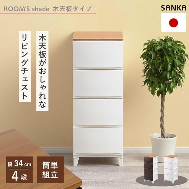 サンカ ルームス 木天板 収納 チェスト ホワイト 白 スリム 4段 (幅34×奥行42×高さ88cm) スルっと引き出せて スキッと締まる引き出し キズ付きにくいマット加工パネル 簡単組み立て 日本製 衣装ケース タンス ROOM'S shade squ+ RSDM-S344WH