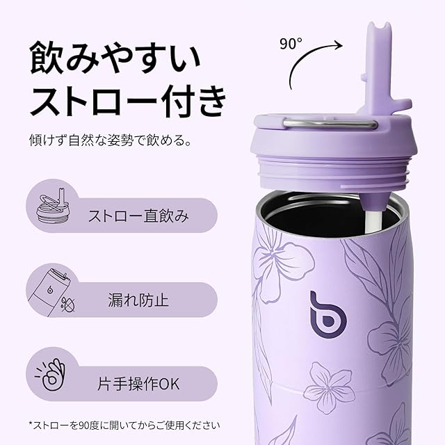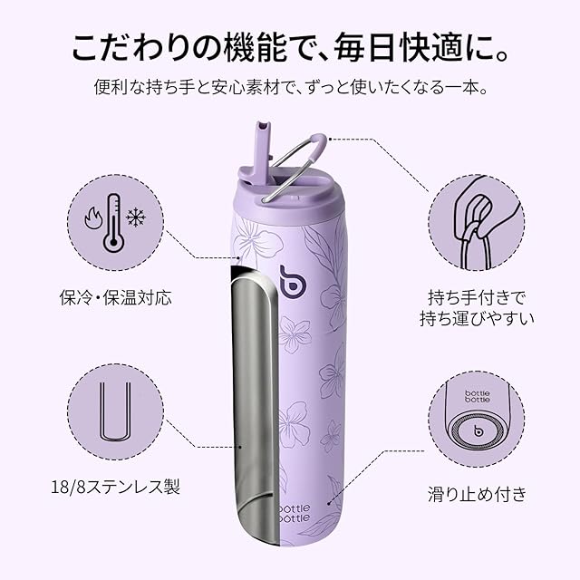 商品名:BOTTLE BOTTLE 水筒 1リットル 大容量 1000ml ストロー付き 直飲み 保温保冷 真空断熱 子供 大人 持ち手付き おしゃれ 1L ボトル ステンレス 魔法瓶 二重構造 女の子 男の子 持ち運び スポーツ アウトドア パープルブルーム