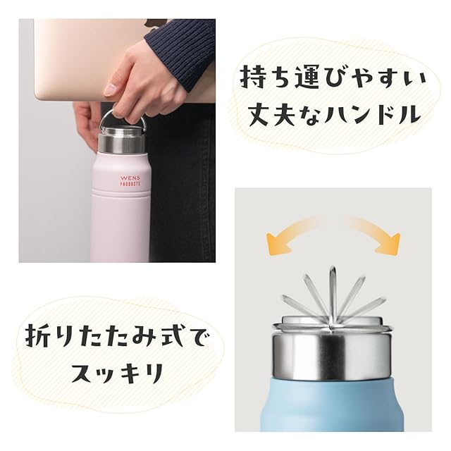 パウダー塗装でキズつきにくく滑りにくいいタフなボトルです。丈夫なステンレス製ハンドル付きでアウトドアに最適。広口で氷が入れやすく、ドリップしたコーヒーの香りも楽しめます。最小限のパーツ数で洗いやすい。真空断熱構造&内びん銅メッキ加工で保温保冷効果が高く、飲み物の美味しい温度が長持ち。