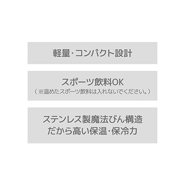 内びん:ステンレス鋼 / 胴部:ステンレス鋼(ポリエステル樹脂塗装) / フタ・せん本体・飲み口:ポリプロピレン / フタパッキン・せんパッキン:シリコーンゴム