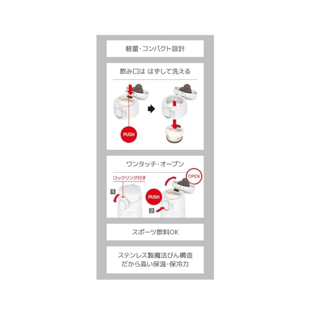 ステンレス製魔法びん構造により、高い保温力・保冷力でおいしい温度を長時間キープ