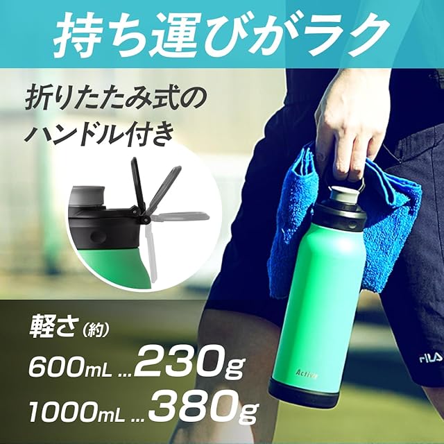 アトラス 水筒 1リットル 直飲み 保冷 真空断熱 スポーツボトル 軽量 スポーツドリンク対応 大容量 持ち運びに便利 ハンドル付き ダイレクトボトル アクティバ ブライトグリーン ADHB-1000BRGR