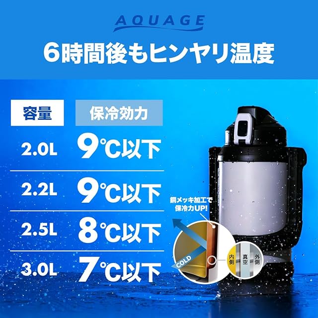 【大容量 2.5リットル】 アトラス 水筒 保冷 スポーツジャグ スポーツドリンク対応 真空断熱 ステンレス 直飲み 洗いやすい ワンタッチ 広口 手が入る ハンドル付き 持ちやすい 底プレート付き ブルー AQUAGE アクアージュ ADJB-2500BL