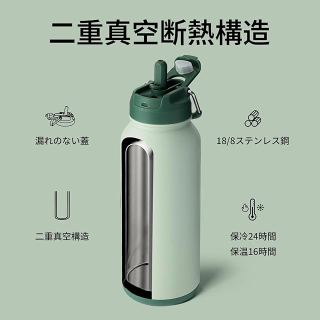 商品名:BOTTLE BOTTLE 水筒 850ml 大容量 ステンレスボトル 底部收纳 2WAY蓋 ストロー付き 直飲み 真空断熱 保冷 食洗機対応 漏れ防止 魔法びん スポーツボトル グリーン