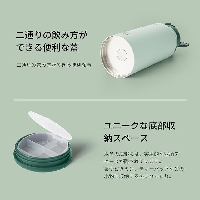 【ユニークな底部収納スペース】Bottle Bottle水筒の底部には、実用的な収納スペースが隠されています。この取り外し可能なスペースは、薬やビタミン、ティーバッグなどの小物を収納するのにぴったり。使い勝手の良さと便利さが一体となったデザインです。