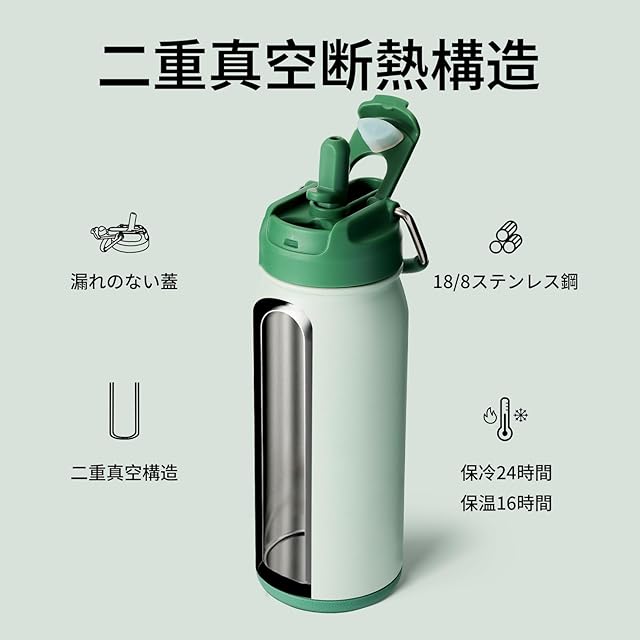 商品名:BOTTLE BOTTLE 水筒 500ml 子供 ステンレスボトル 直飲み スポーツボトル 2WAY蓋 ストロー付き 底部收纳 真空断熱 漏れ防止 男の子 女の子 魔法びん グリーン