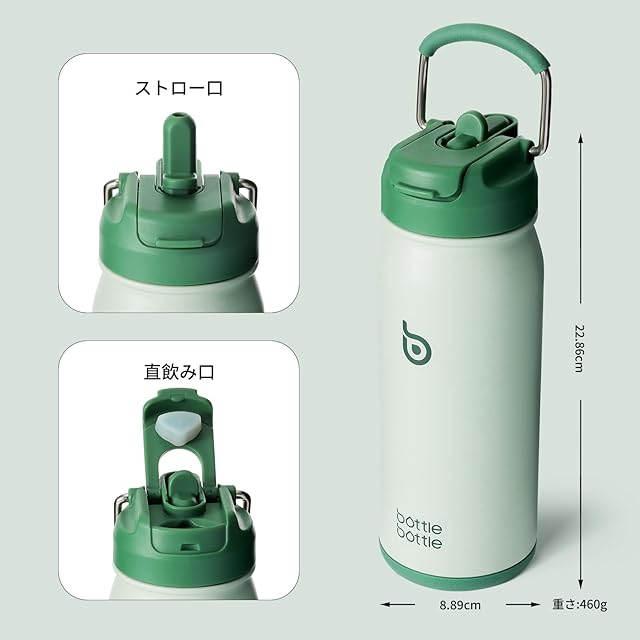 BOTTLE BOTTLE 水筒 500ml 子供 ステンレスボトル 直飲み スポーツボトル 2WAY蓋 ストロー付き 底部收纳 真空断熱 漏れ防止 男の子 女の子 魔法びん グリーン