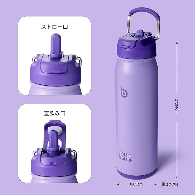 BOTTLE BOTTLE 水筒 650ml 子供 ストロー付き 直飲み 保冷水筒 底部收纳 2WAY蓋 真空断熱 ステンレスボトル 漏れ防止 男の子 女の子 魔法びん スポーツボトル パープル