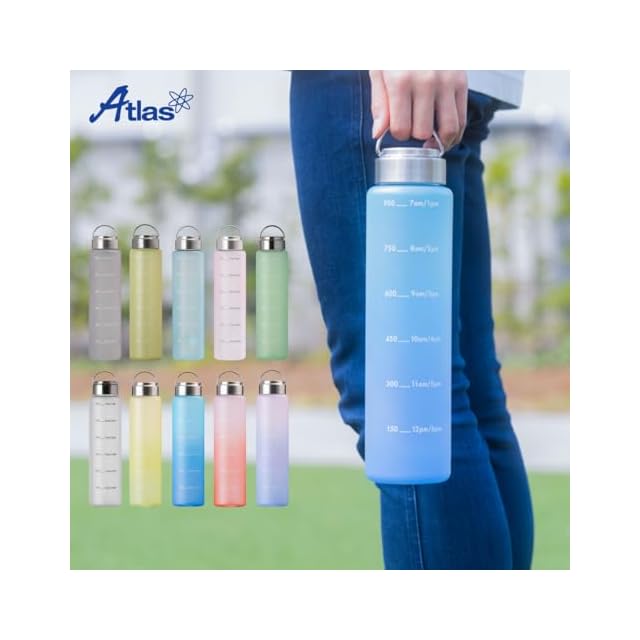 アトラス ウォーターボトル 水筒 1000ml 1リットル 直飲み メモリ付き タイムマーカー付き 持ち手付き ハンドル付き 軽量 洗いやすい 広口 大容量 スポーツボトル BPAフリー グレー AJB-1000GY