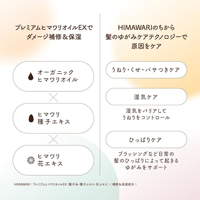 【髪のゆがみとは?】"髪がパサつく"、"ハネ・うねりが出やすい"など、30代から感じ始める髪質の変化は、髪内部と外側それぞれの脂質と水分バランスの乱れ(=髪のゆがみ)が原因。ディアボーテHIMAWARIに配合された「プレミアムヒマワリオイルEX*」が、これらのバランスを整え、うねり・くせ・パサつきの原因となる髪のゆがみをケア。*オーガニックヒマワリオイル、ヒマワリ種子エキス、ヒマワリ花エキス