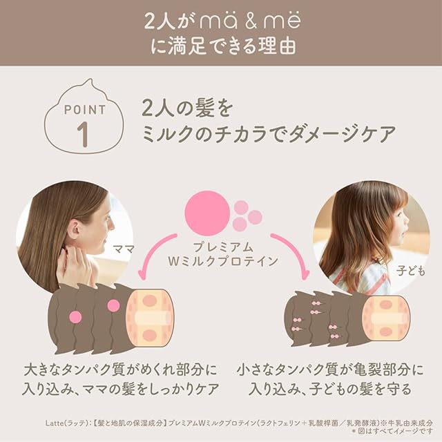 【変化を感じるママの髪と成長過程の子どもの髪に】髪と地肌の保湿成分プレミアムWミルクプロテイン*配合で、ママと子どもの異なるダメージをケア。毛先までうるおい、からまない。指どおりツルン。*ラクトフェリン+乳酸桿菌/乳発酵液 ※牛乳由来成分配合