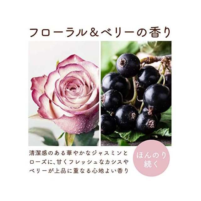 【フローラル&ベリーの香り】清潔感のある華やかなジャスミンとローズに、甘くフレッシュなカシスやベリーが上品に重なる心地よい香り。ほんのり続く。