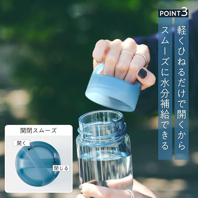 【ひとひねりで開閉できる】通常のウォーターボトルと異なり、ひとひねりで開閉可能。開閉がスムーズで水分補給しやすい構造です。持ち手は指がしっかり入るので携帯しやすくなっています。