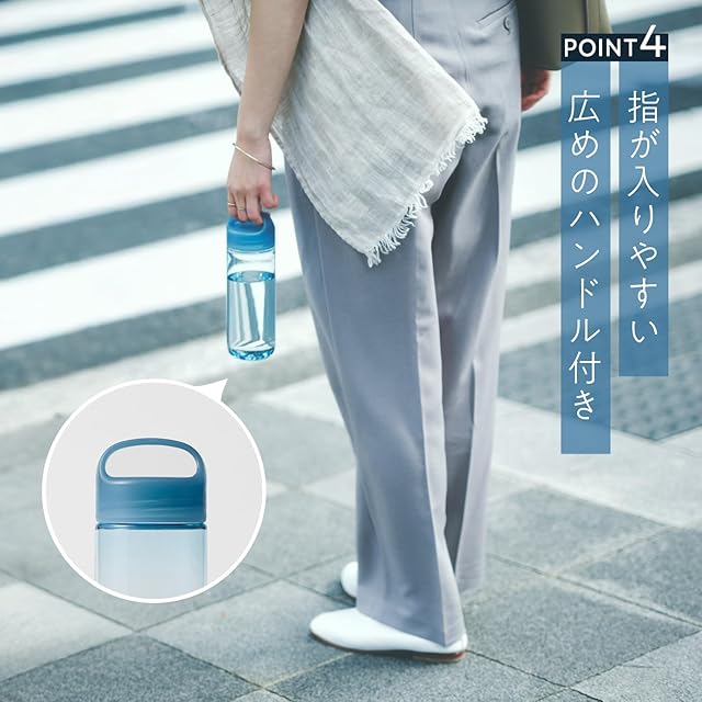 【ひとひねりで開閉できる】通常のウォーターボトルと異なり、ひとひねりで開閉可能。開閉がスムーズで水分補給しやすい構造です。持ち手は指がしっかり入るので携帯しやすくなっています。