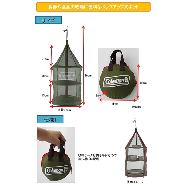 商品名:Coleman(コールマン) ハンギングドライネット2 グリーン 約180g 2000026811 アウトドア キャンプ 食器乾燥 ポップアップ ワンタッチ コンパクト収納 防虫 ドライフーズ 衛生的 収納ケース付き