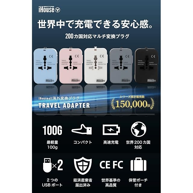 iHouse all 海外変換プラグ 充電 コンセント 海外旅行 2USBポート 全世界対応 経済産業省承認 Aタイプ Cタイプ Oタイプ BFタイプ 正規1年 (グレー)