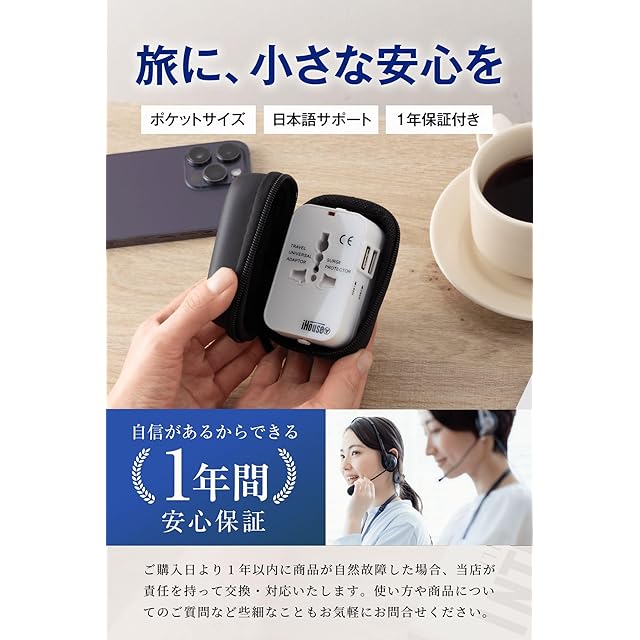 【パッケージ内容 】海外変換プラグ本体、ケース、説明書 【サイズ】海外変換プラグ:H75 x W50 x D 40 mm / 91.6g、ケース:H 98 x W 80 x D 65 mm / 44.7g、日本語説明書/書。 ) 2個 USBポート内蔵 (USB TypeC非対応)USBポートを2個内蔵しているので、iPhoneなどのスマホを同時に充電できます。 シンプルなデザイン セキュリティドア、過電圧保護、過充電保護、短絡保護がありますので、充電を保障し、過負荷または短絡の心配が要りません。