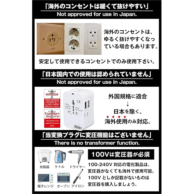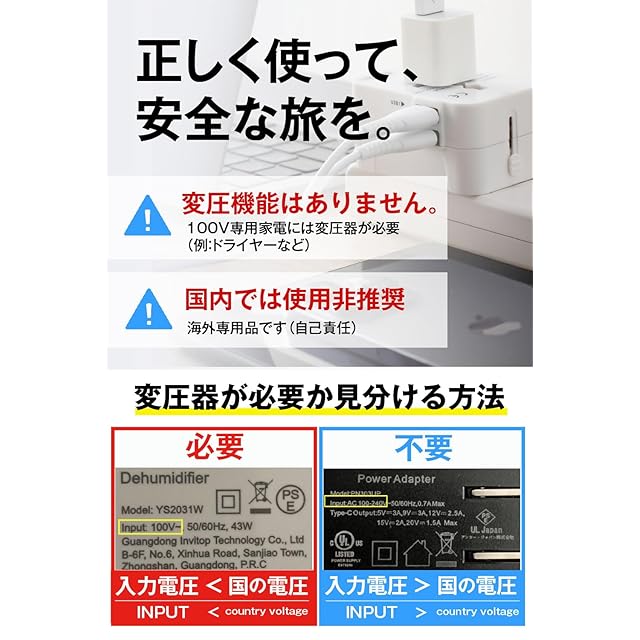本製品に変圧機能はございませんので、ご使用の際は必ず電圧をご確認ください。100-240V対応と表記の電化製品は海外仕様電化製品のため、変圧器がなくても使用可能です。100Vとしか記載がないものは日本国内国内仕様のものの為、別途変圧器をご用意ください。また、炊飯器、ヘアドライヤーなどの高出力電化製品は変圧器と併用してご使用いただく必要があります。